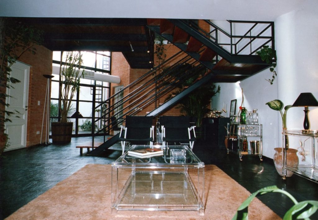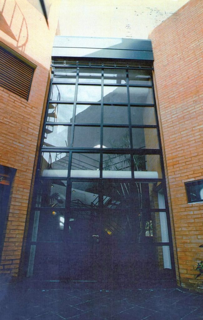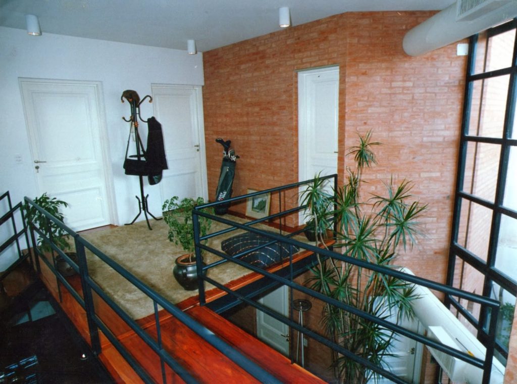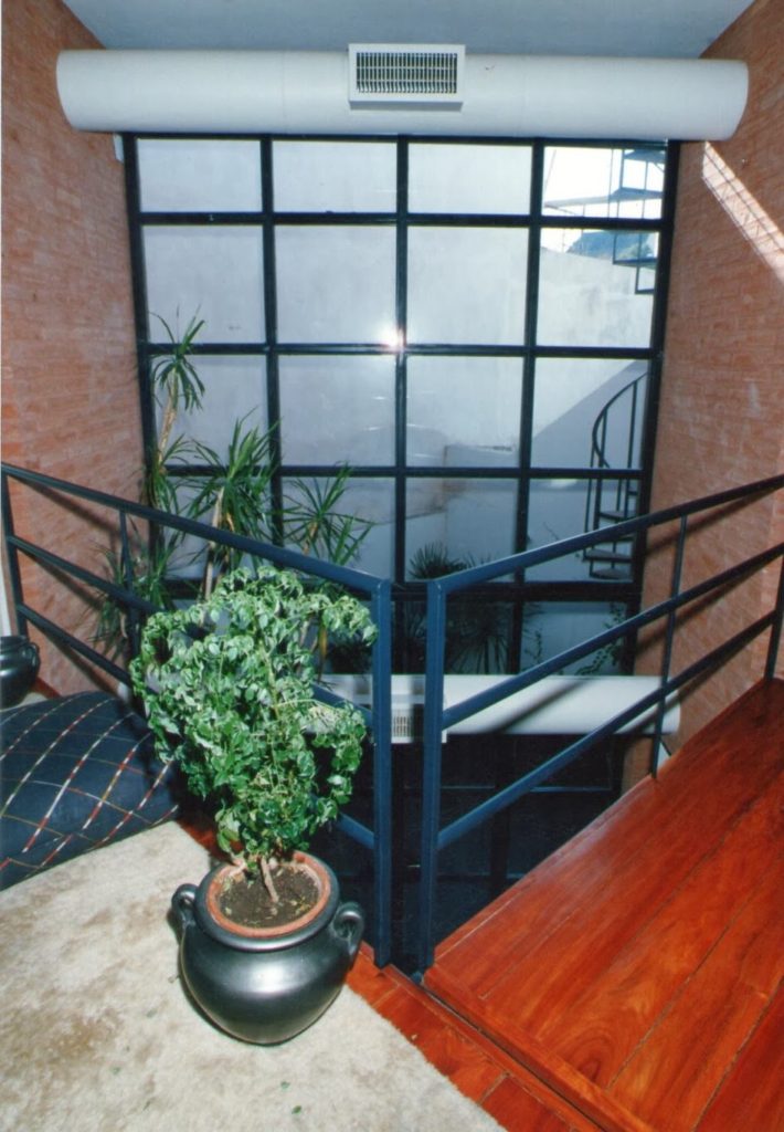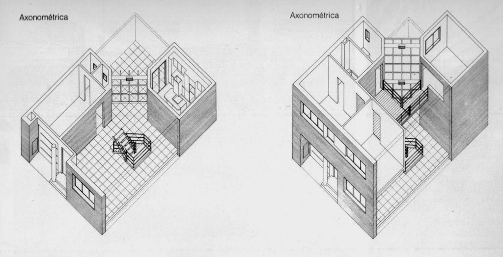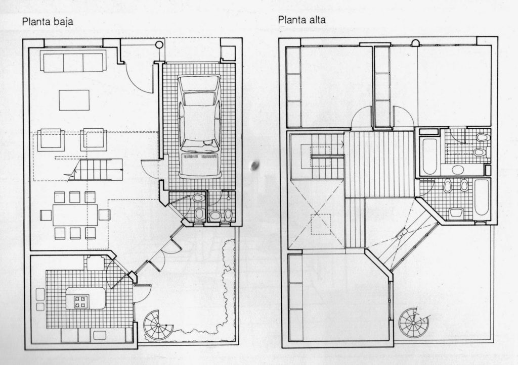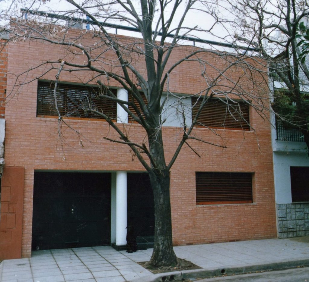 La casa se organiza según dos volúmenes de ladrillo dispuestos en esquinas del lote opuestos diagonalmente y que contienen garage y baños uno y cocina el otro. Estos volúmenes producen como contraforma el espacio público (estar-comedor) que fluye verticalmente hacia la planta alta, donde se verifica funcionalmente la distribución a dormitorios y escritorio. La expresión de la arquitectura contribuye a enfatizar la propuesta espacial-funcional. Los elementos conformantes del espacio público el plano del solado y los volúmenes de ladrillo, se concretan sin solución de continuidad en el interior y el exterior. La escalera y el hall de acceso a los espacios privados en planta alta se resuelven con otra tecnología: hierro y madera, afirmando su independencia del sistema anterior.